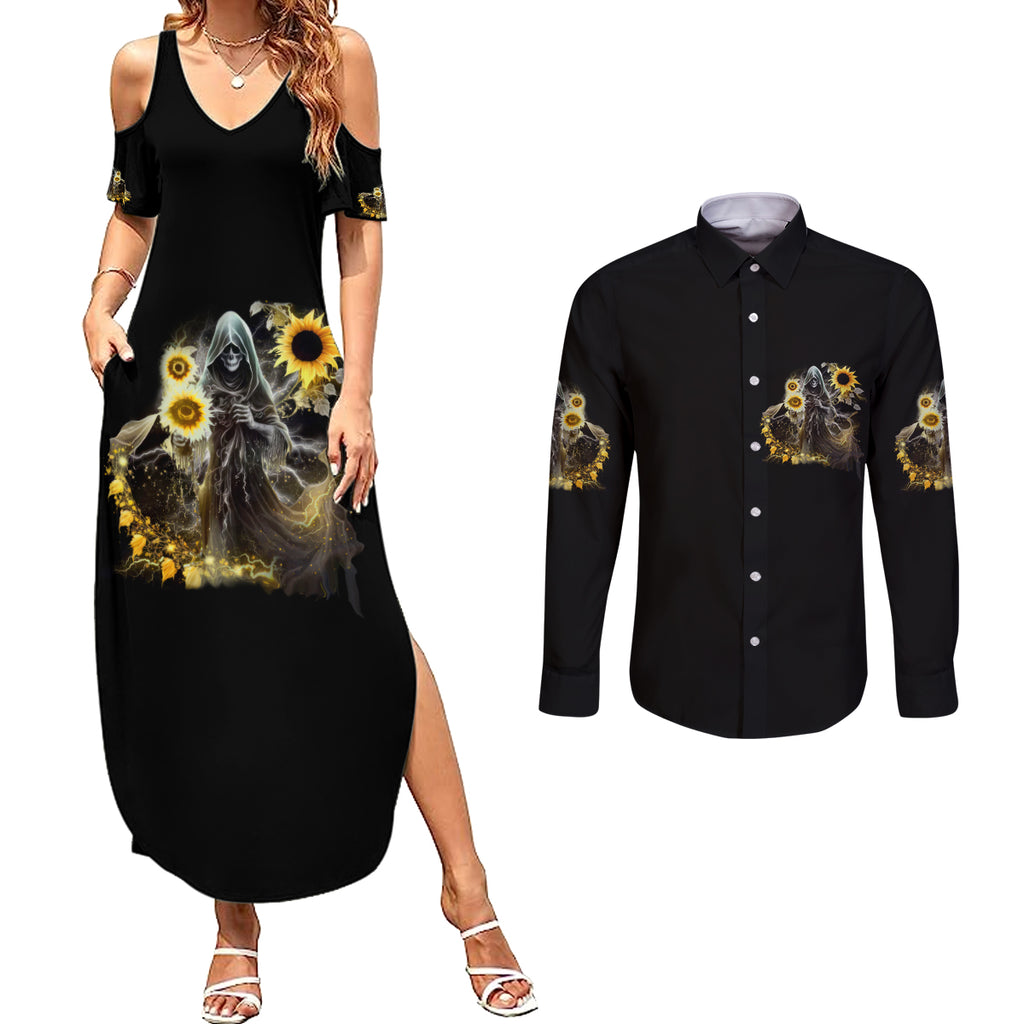 I Am The Storm Reaper Sunflower Roses Wings Couples Matching Summer Maxi Dress and Long Sleeve Button Shirt